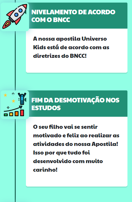 “Adquiri para meu filho semana passada e vou usar com meu alunos também já que sou professora e mãe. O kit Universo Kids é uma maravilha, bem organizado na sequência e muito didático, meu filho amou e tenho certeza que meus alunos vão amar também 😍 Já indiquei para minha amigas”